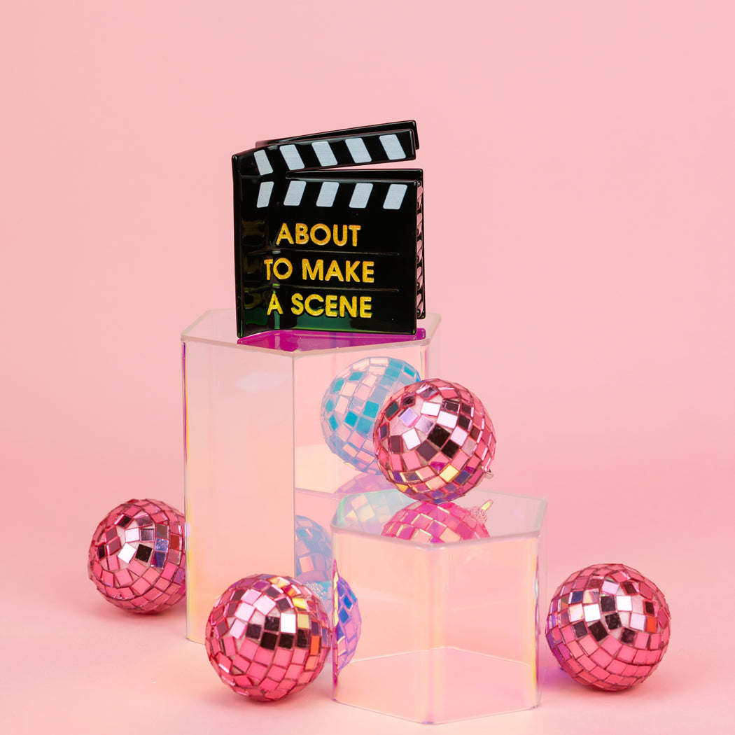 Lights, camera, chaos. Our About to Make a Scene acetate hair claw clip is made for the girl who brings main-character energy everywhere she goes. Shaped like a glossy black director’s clapboard with gold lettering, it’s the perfect accessory for dramatic exits, emotional entrances, and everyday hair emergencies.