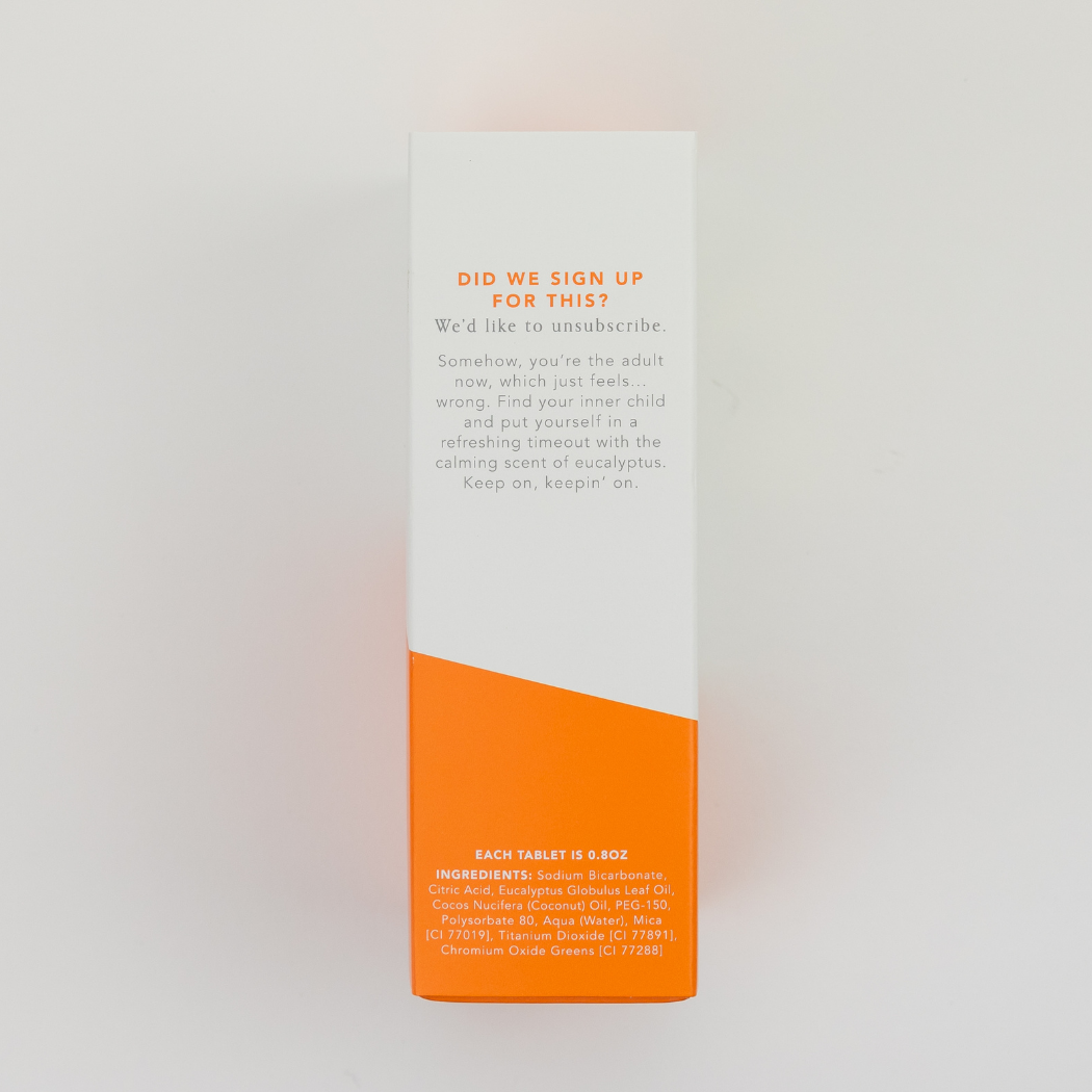Sodium Bicarbonate, Citric Acid, Eucalyptus Globulus Leaf Oil, Cocos Nucifera (Coconut) Oil, PEG-150, Polysorbate 80, Aqua (Water), Mica (CI 77019), Titanium Dioxide (CI 77891), Chromium Oxide Greens (CI 77288)