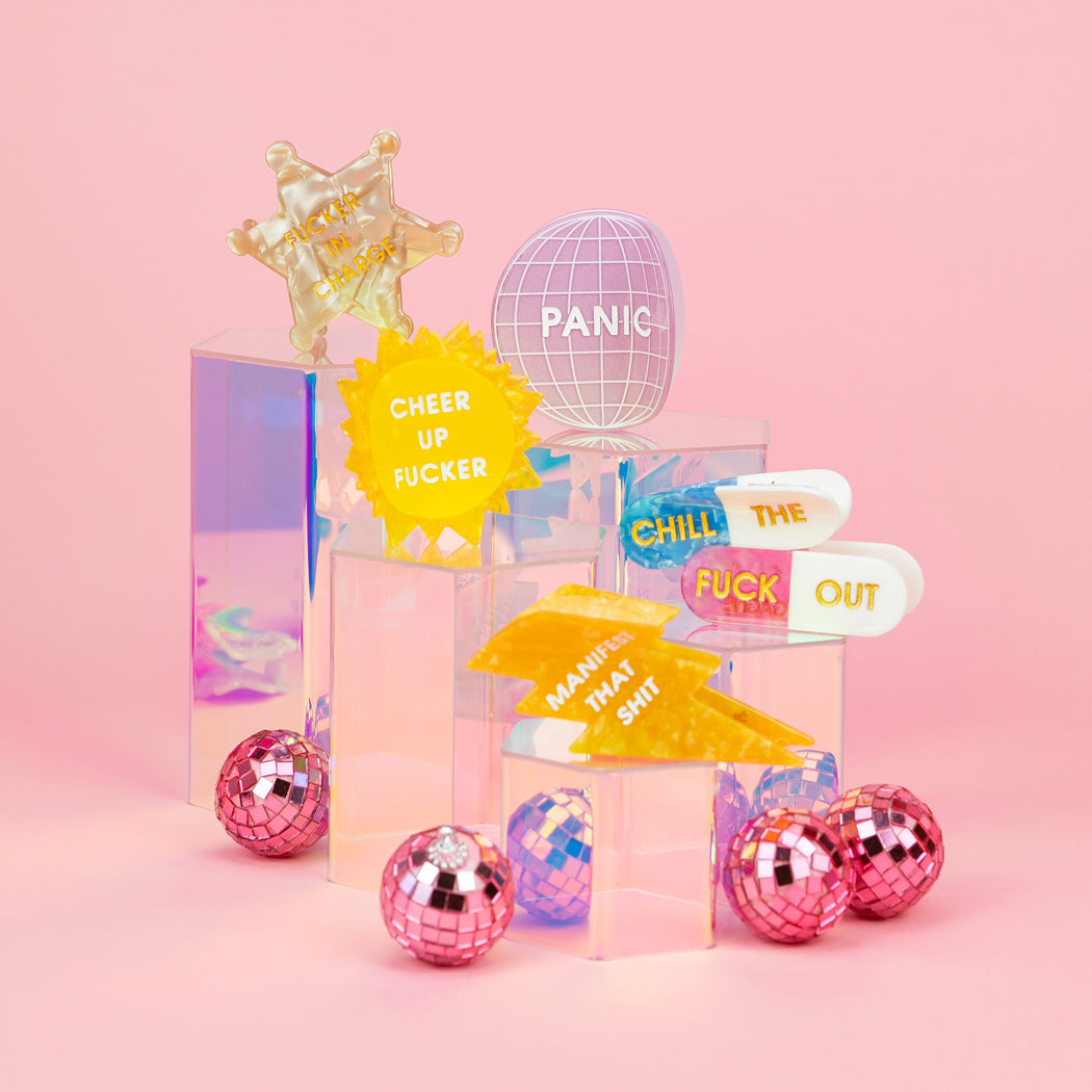 Bring the sunshine and the sass. Our Cheer Up Fucker acetate hair claw clip is a bright yellow burst of joy (with a side of attitude), guaranteed to lift spirits and ponytails alike. Made from high-quality marbled acetate with bold lettering, this sunny little pep talk is the perfect way to add cheer — whether your hair is cooperating today or not.