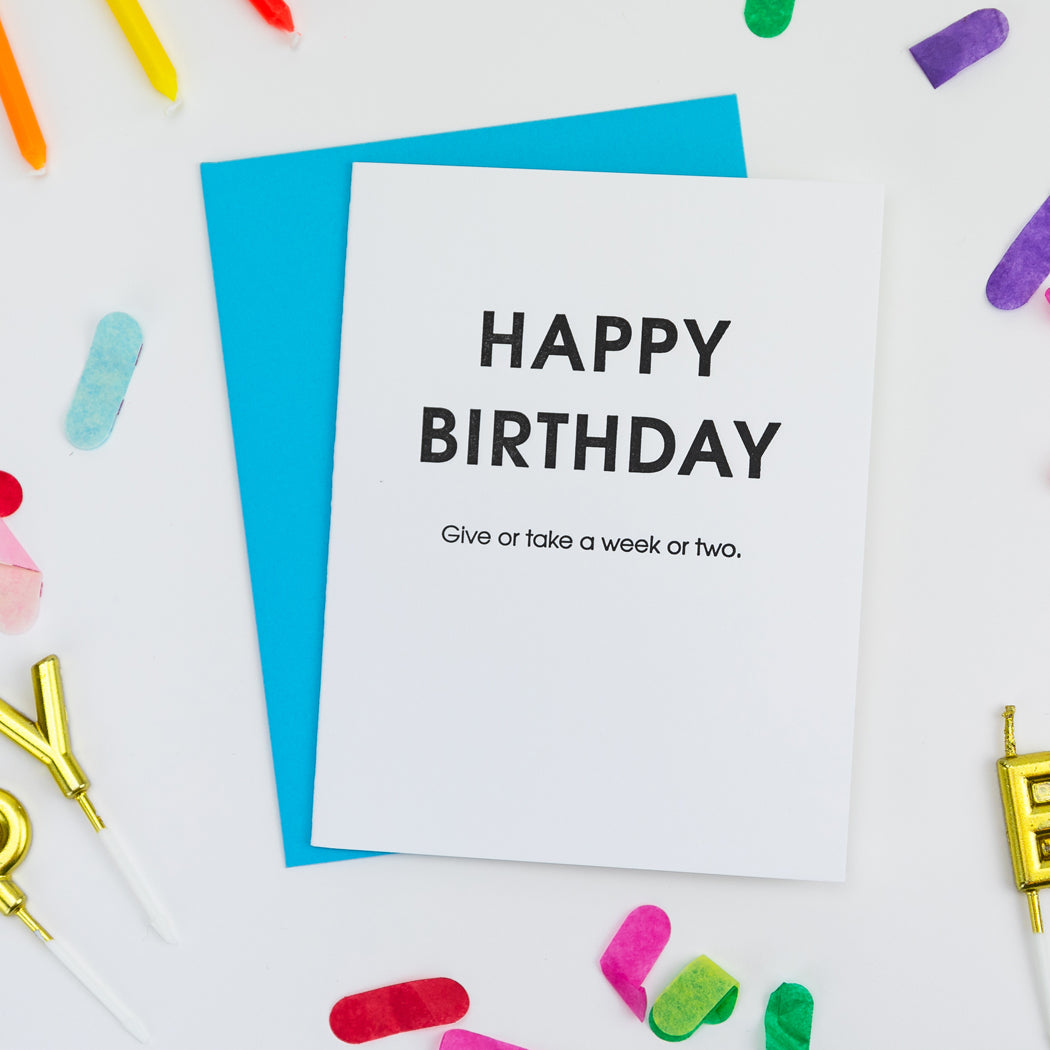 Happy Birthday Give or Take A Week Or Two Belated Birthday - Letterpress Card