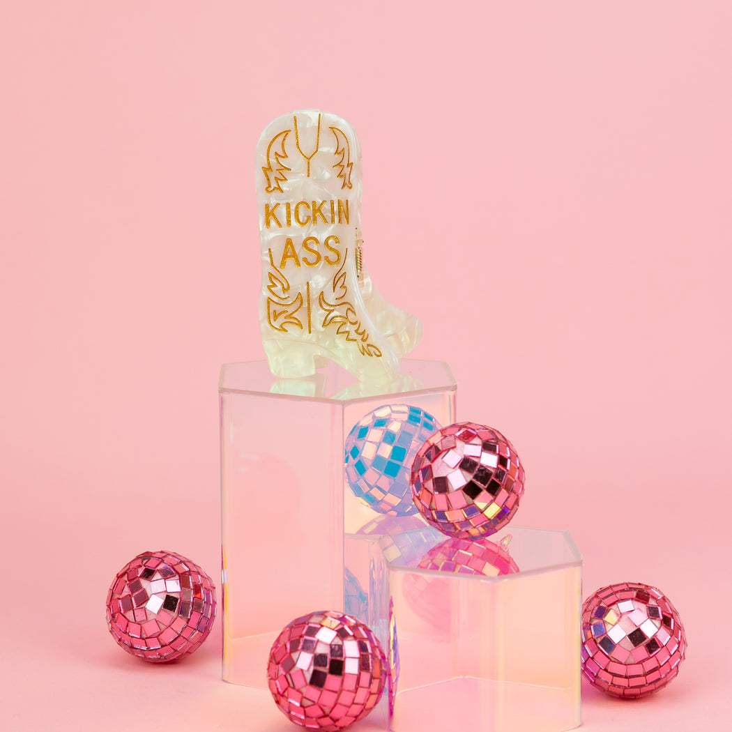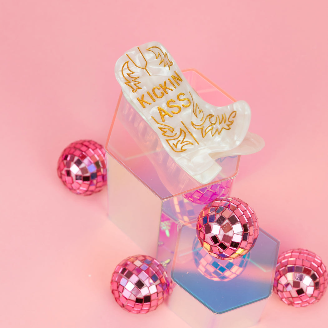 Saddle up, buttercup — this clip means business. Our Kickin’ Ass acetate hair claw clip brings all the yeehaw energy with a pearly western boot silhouette and bold gold lettering. It’s the perfect accessory for rodeo days, workdays, meltdown days, and every day you’re out here doing your damn best.