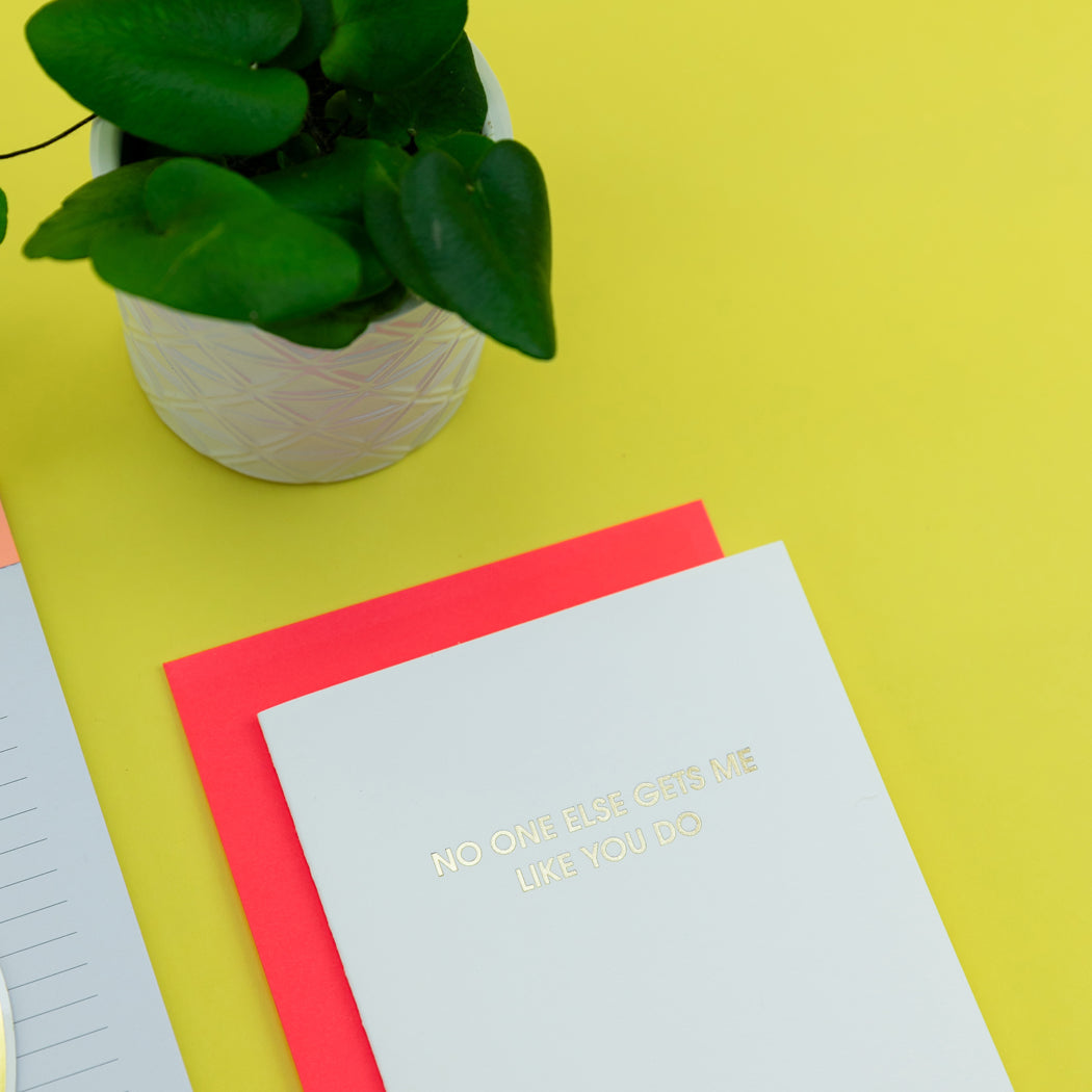 Our “No One Else Gets Me Like You Do” card is letterpress printed with shimmering gold foil on a vintage printing press in sunny California. A bold way to say you’re my person.