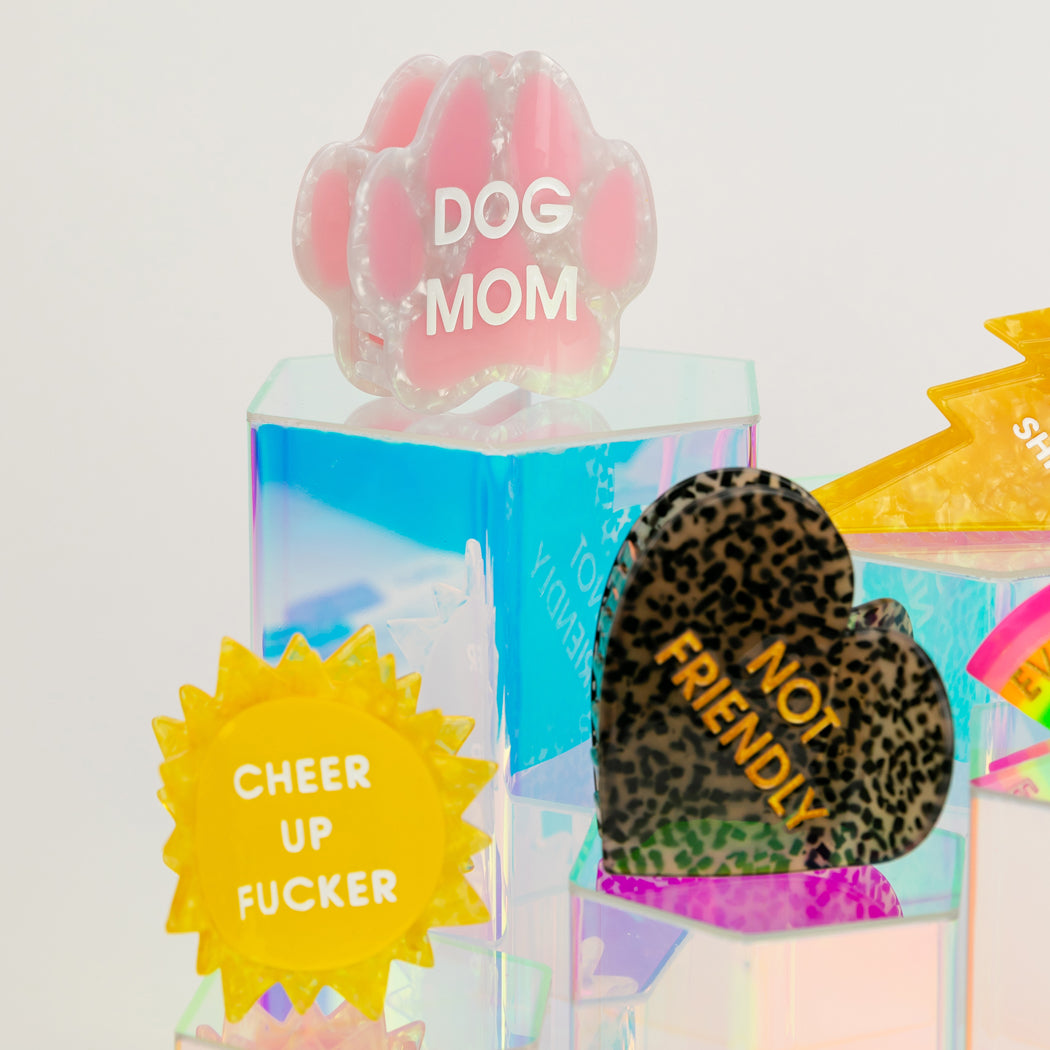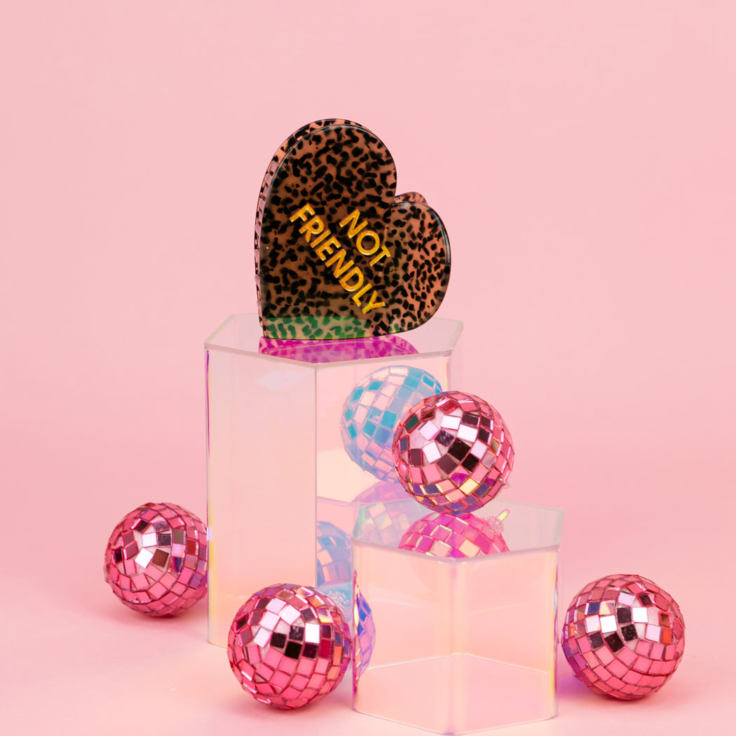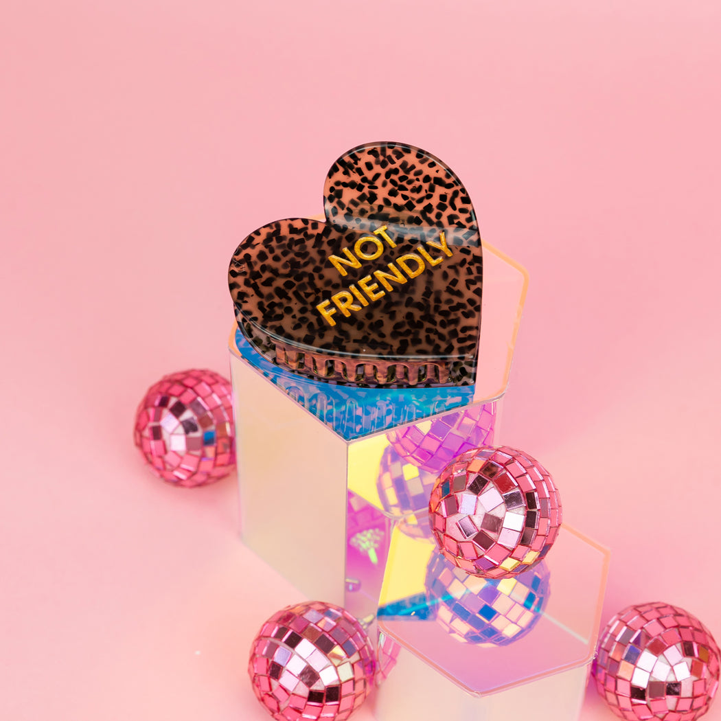 Finally, a hair clip that says what your face already does. Our Not Friendly heart-shaped acetate claw is for the girlies who don’t do small talk, don’t do fake smiles, and definitely don’t do unnecessary human interaction. Wrapped in a chic leopard pattern with bold gold lettering, it’s the perfect accessory for “please don’t” energy.