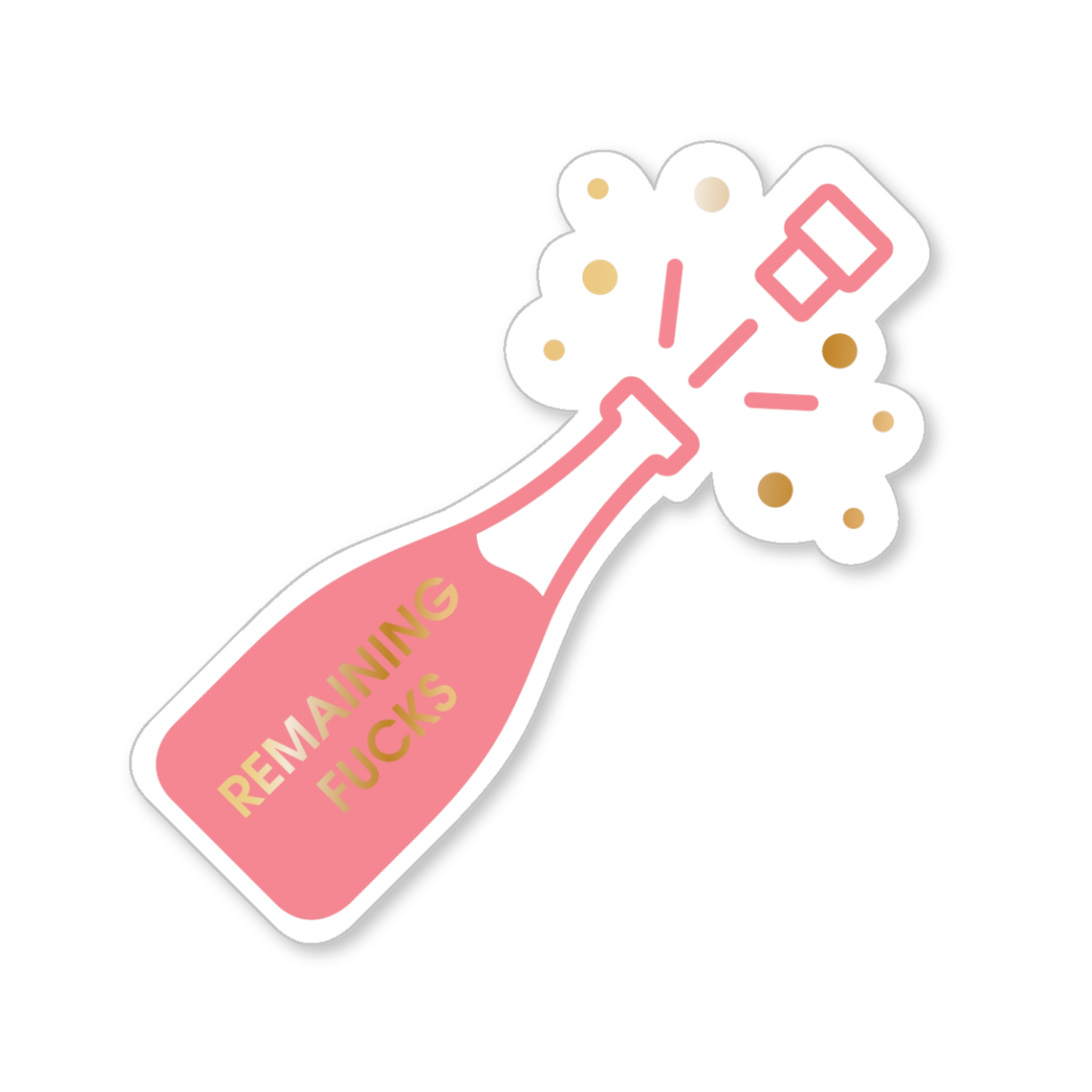 Pop, fizz, and release the last of your patience with this cheeky Remaining Fucks sticker. Designed as a champagne bottle that’s clearly running on empty, it’s the perfect way to declare you’re fresh out—while still keeping it bubbly. Waterproof, weather-proof, and dishwasher safe, it sticks anywhere you need a splash of humor.