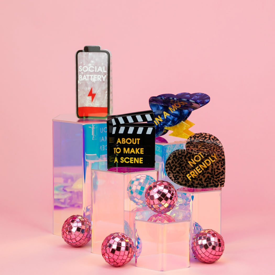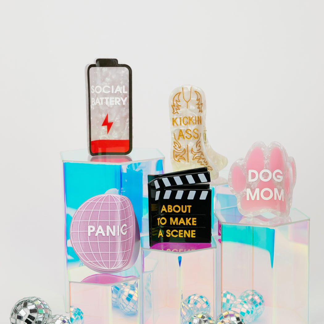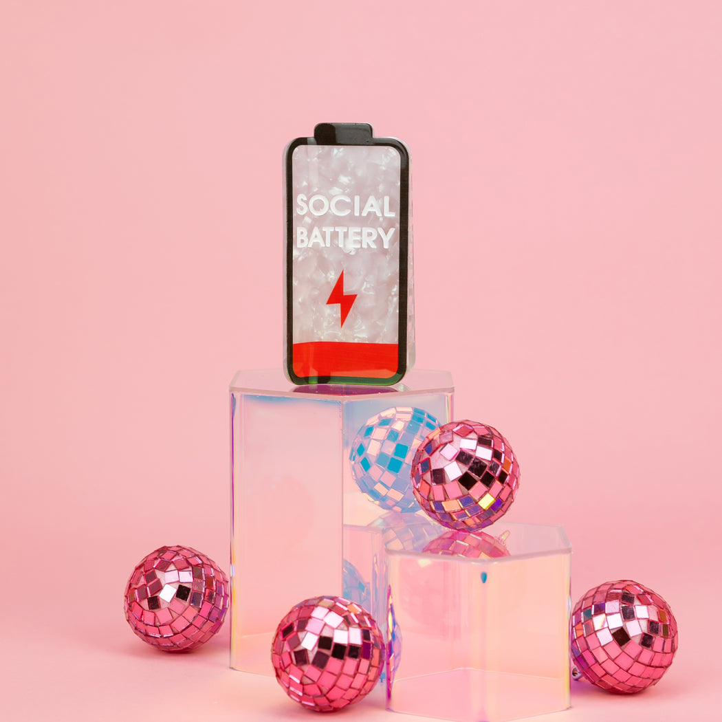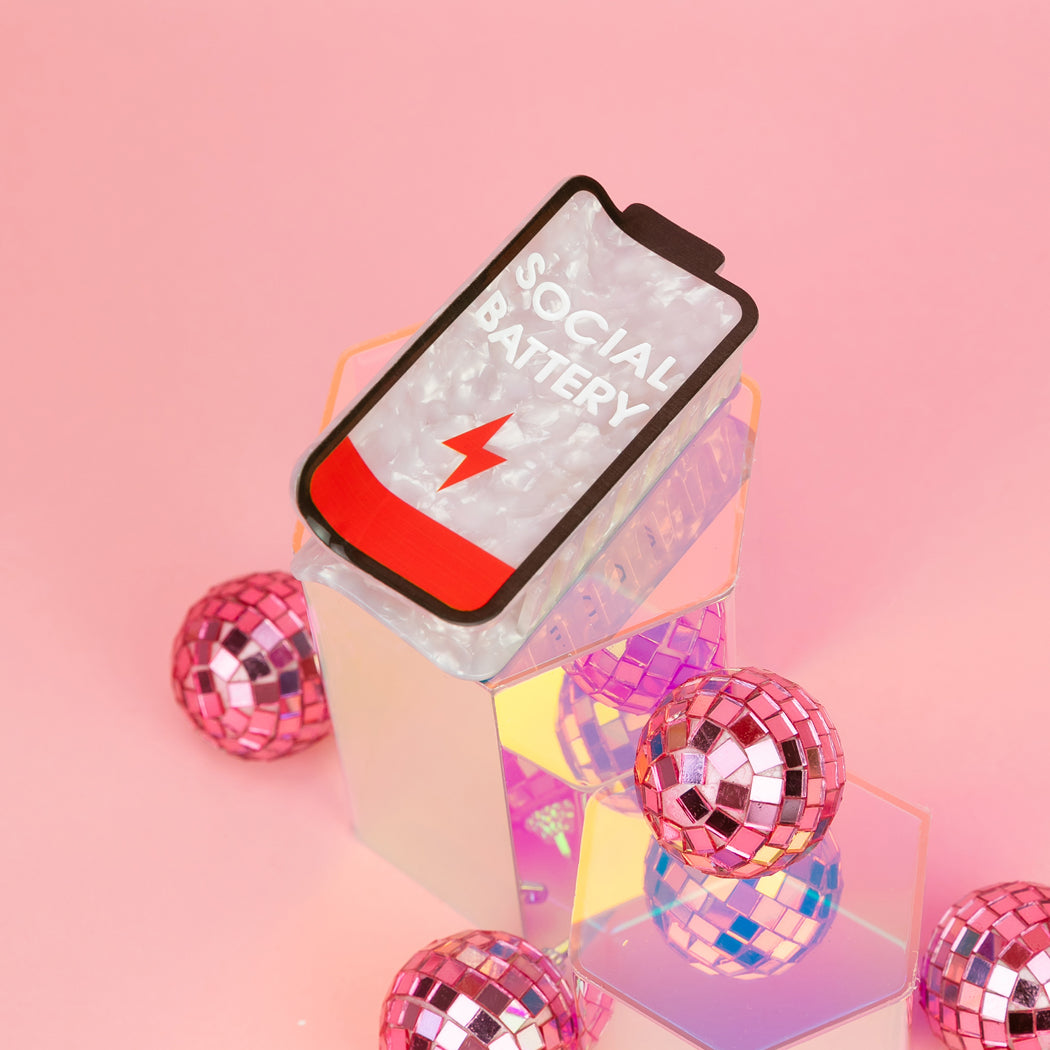 This low-battery hair clip is the universal symbol for “I love you, but please stop talking to me.” With its pearly acetate finish and bright red “running on fumes” bar, it’s the perfect accessory for introverts, selectively social extroverts, and anyone who needs to manage expectations before someone tries to make plans.