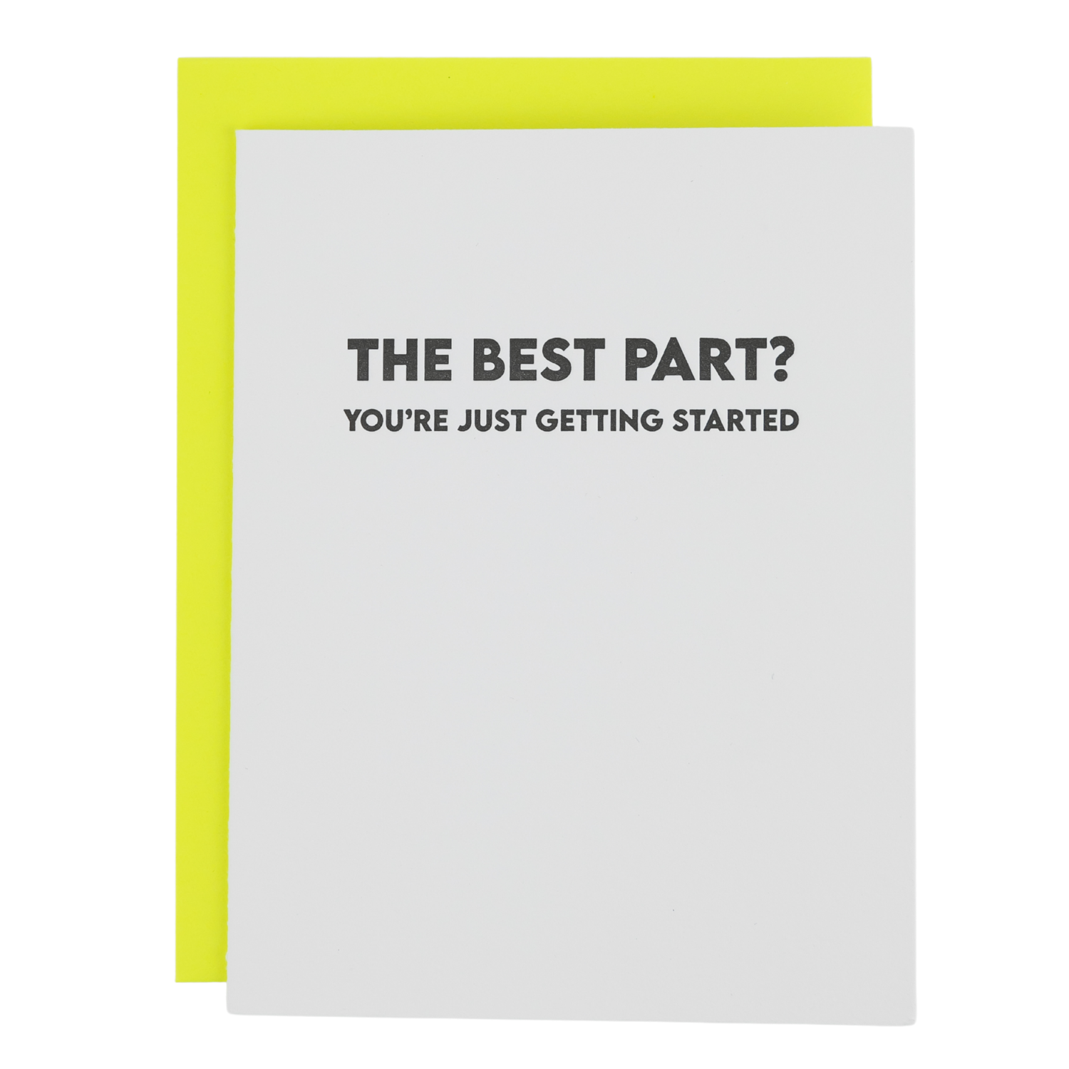 Our “The Best Part? You’re Just Getting Started.” card is the ultimate hype message for graduates stepping into their next big chapter. Letterpress printed on a vintage press in California and paired with a bright neon envelope, this crisp, modern design delivers encouragement with a bold, celebratory edge.